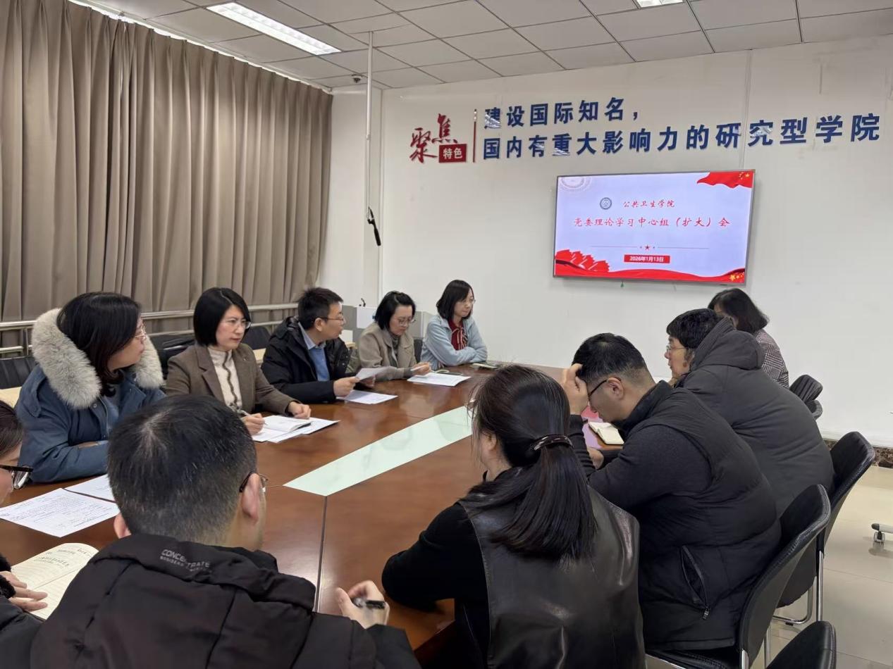 1月13日,公共卫生学院党委在浩园医学教育综合楼B714会议室举行理论学习中心组2026年度第1次理论学习(扩大)会。学院党政领导班子成员、系主任、各支部书记共同参加学习。